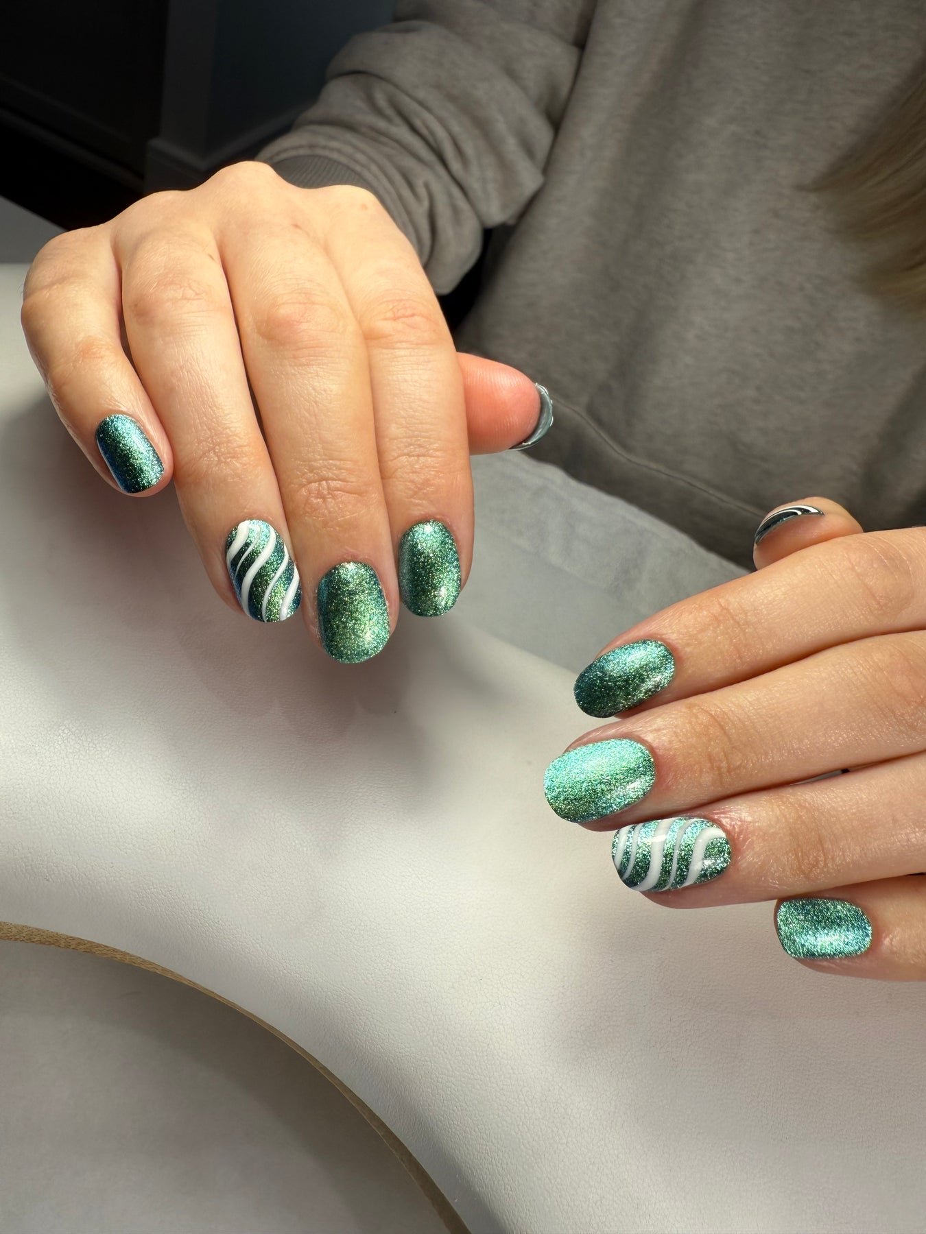 A perfect green shade scattered with chunkier cat eye particles giving it a more glitter like finish