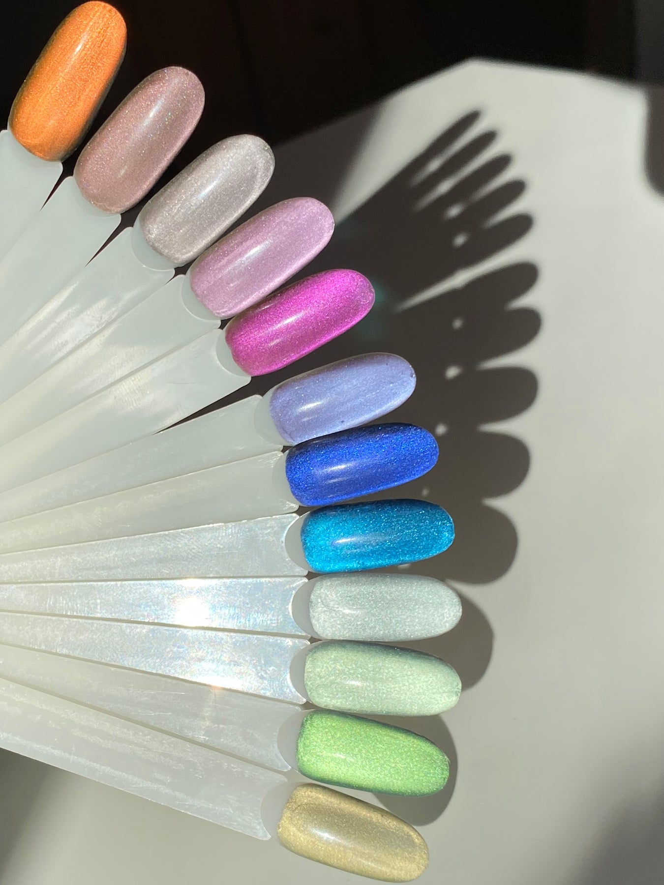 - These powders can be used for Cat eye effects & chromed onto the nail