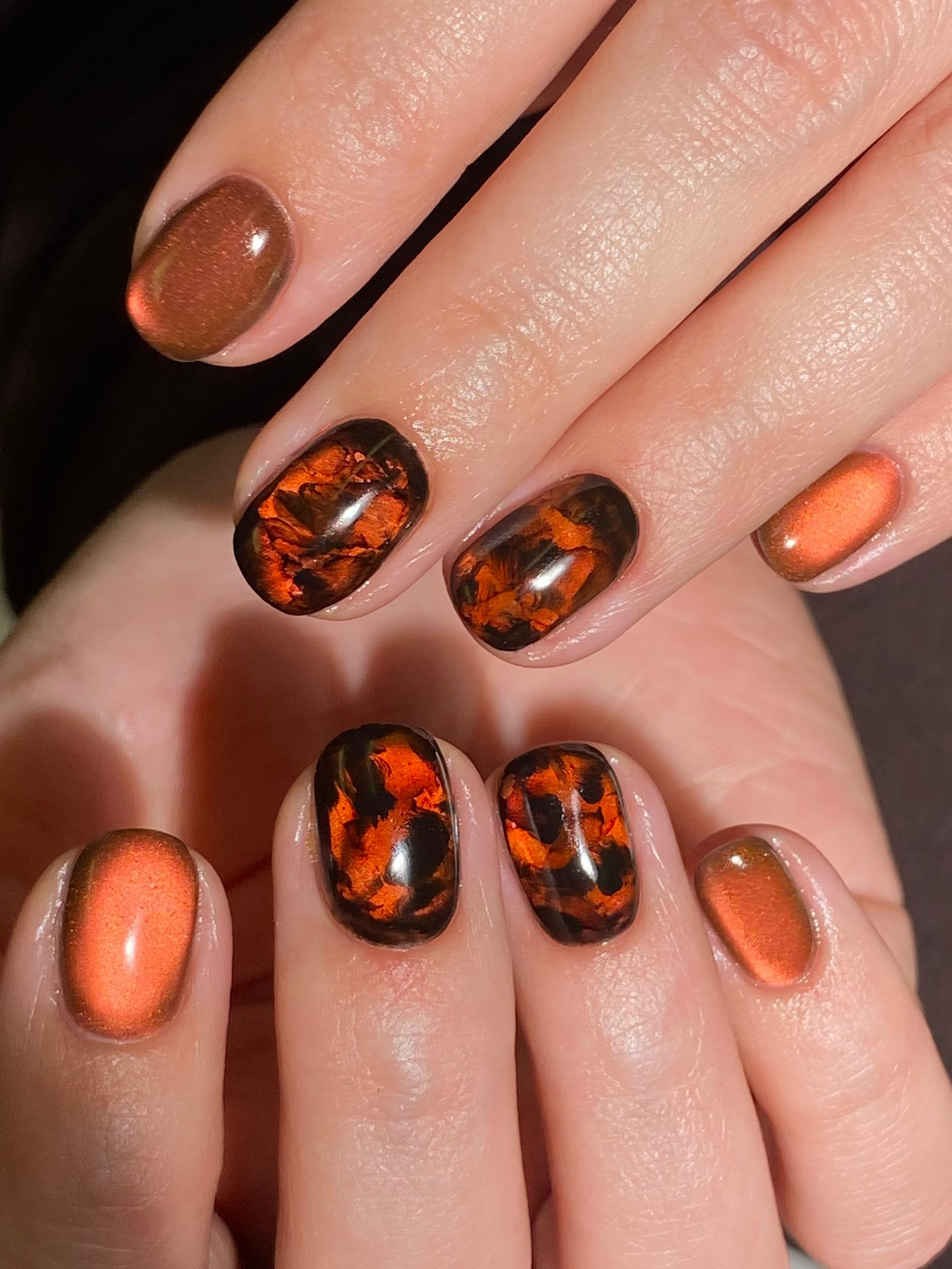 2. Apply your chosen gel colour and cure. Black is especially popular for making the cat eye effect pop!
