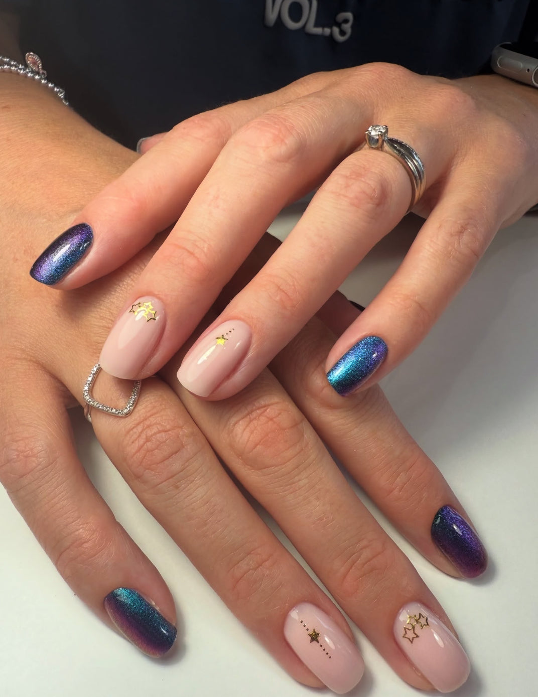 Galaxy is a dazzling cat eye pigment that shifts between vibrant purples and deep greens, capturing the vast beauty of the universe