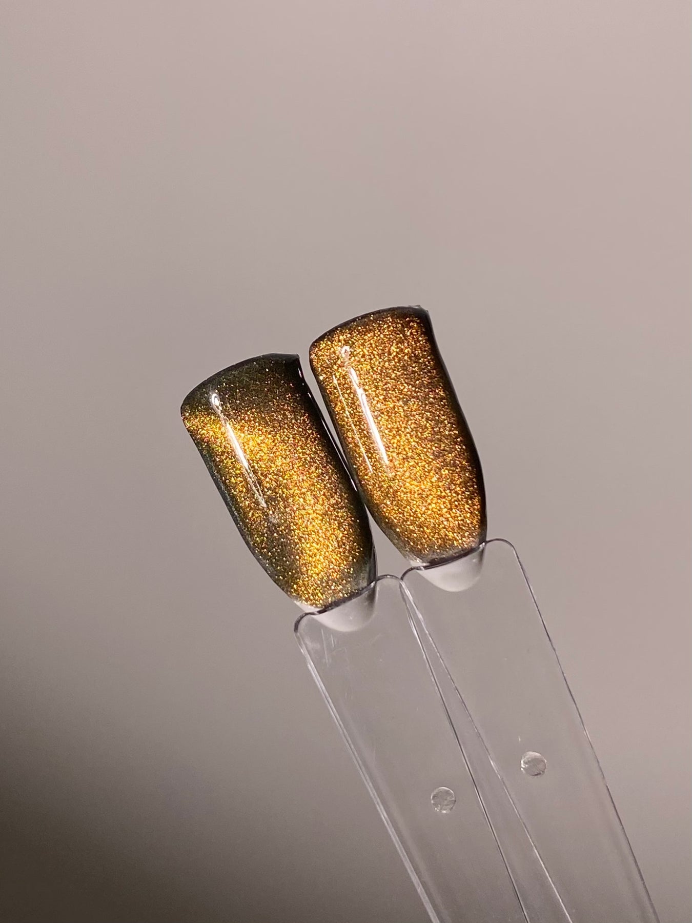 An antique gold with a finer, glittered pigment and smooth cat eye shift