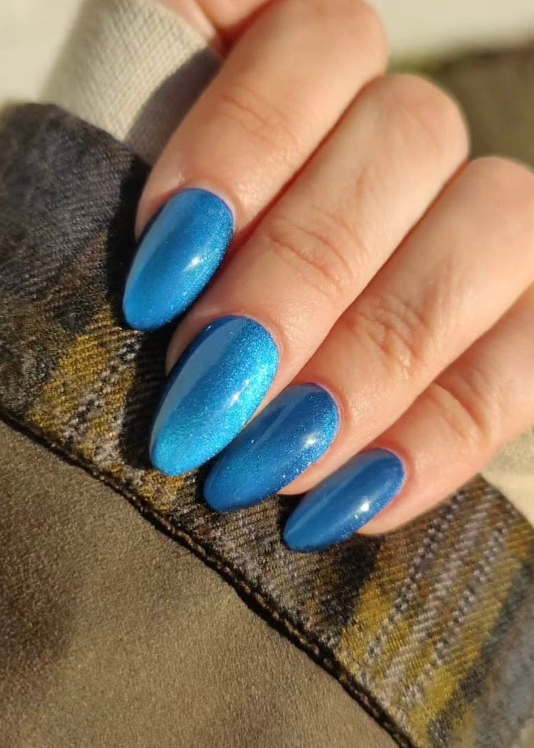 2. Apply your chosen gel colour and cure. Black is especially popular for making the cat eye effect pop!